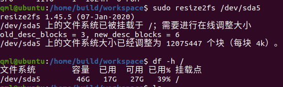 由于 sda5 在扩展分区 sda2 内,需要先扩展 sda2,再扩展 sda5